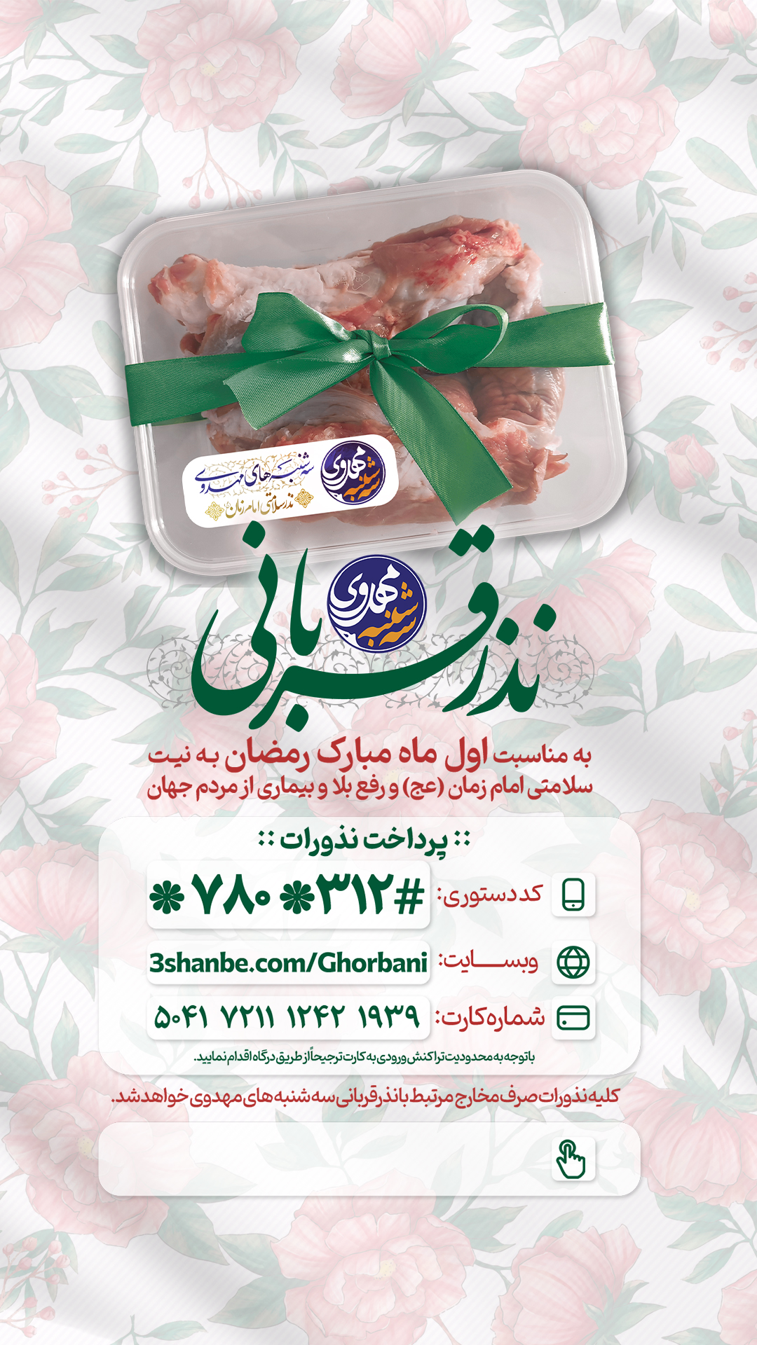 به نیت سلامتی آقا امام زمان (عج) و رفع بلا و بیماری از همه ی مردم جهان، نذر قربانی داشته باشیم.